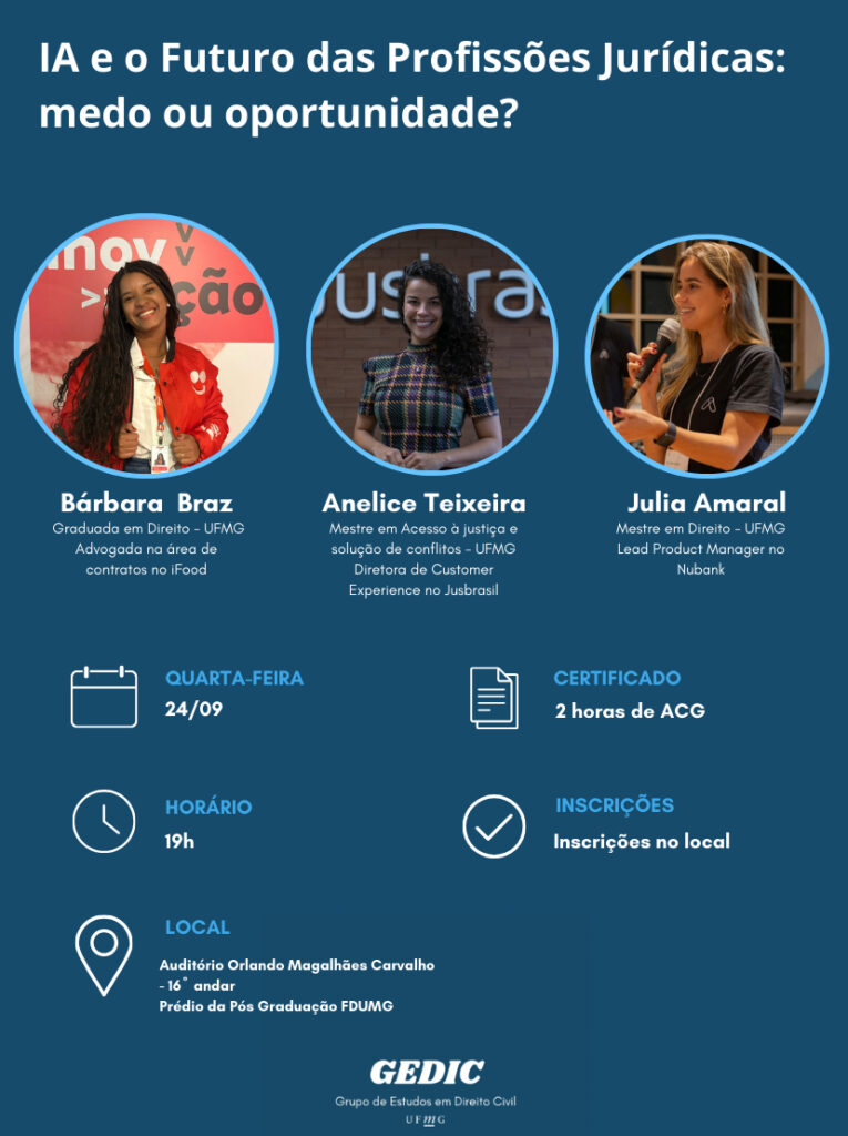O Grupo de Estudos em Direito Civil (GEDIC) tem a satisfação de anunciar mais um evento aberto ao público! Convidamos toda a comunidade acadêmica para a mesa-redonda “IA e o Futuro das Profissões Jurídicas: medo ou oportunidade?”, um espaço de debate sobre como a tecnologia vem transformando o exercício da advocacia e as carreiras jurídicas.
