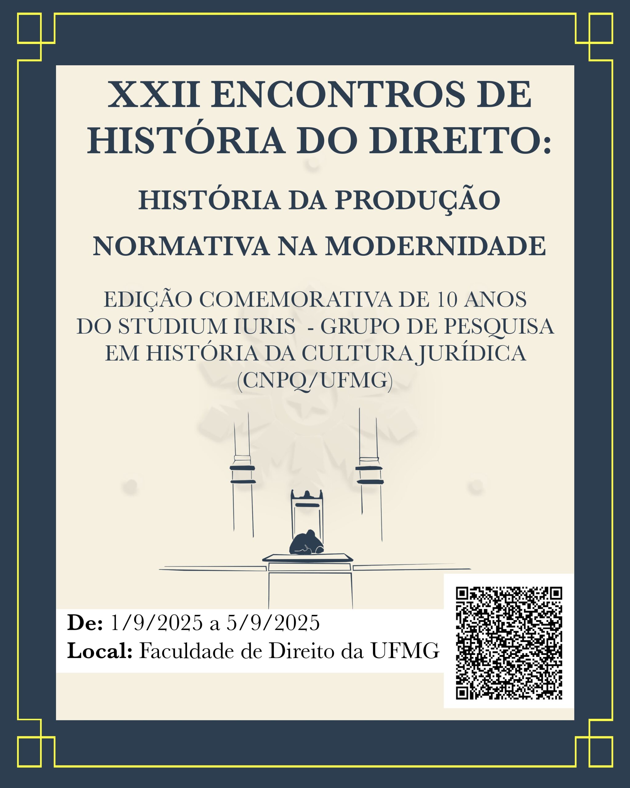 Por decreto soberano, faz-se saber a todos os juristas, historiadores e amantes das ciências que entre os dias 1º de setembro e 5 de setembro do ano da graça de 2025 haverá reunião de eminentes sábios de nossas terras e de outras longínquas para discutir assunto da mais alta importância: a história da produção normativa em nossos tempos. Esse concílio de mentes brilhantes se faz em honra do decenário do grupo que ajuda a manter acesa a chama da paixão histórico-jurídica em nossa pátria: o Studium Iuris – Grupo de Pesquisa em História da Cultura Jurídica (CNPq/UFMG).